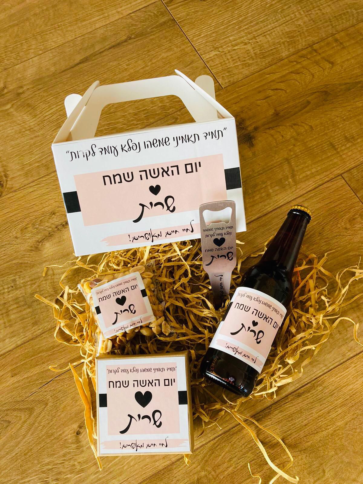 מזוודת קרטון עם בקבוק בירה ממותג, שקית מנצ'יס, פותחן ממותג וקופסא עם מילוי